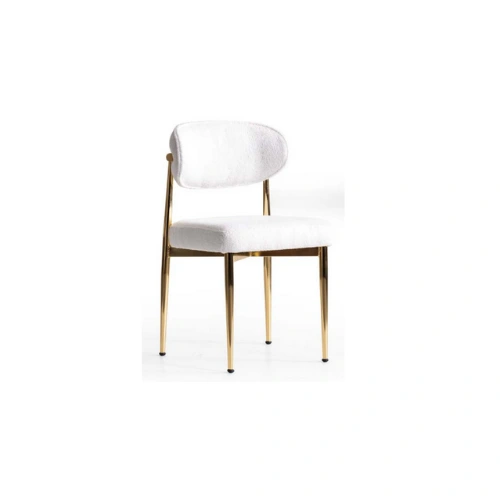 La chaise Angers présente un cadre fin en métal doré poli, contrasté par une assise et un dossier rembourrés en tissu blanc doux effet bouclé. Son design épuré, aux lignes courbes et aériennes, ajoute une touche glamour sans en faire trop.
