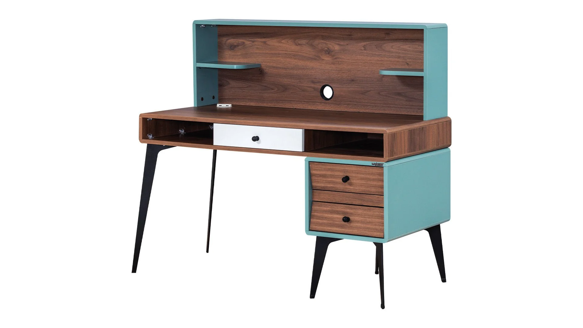 * Tablettes droite et gauche sur le meuble qui donnent au bureau un aspect bien rangé.