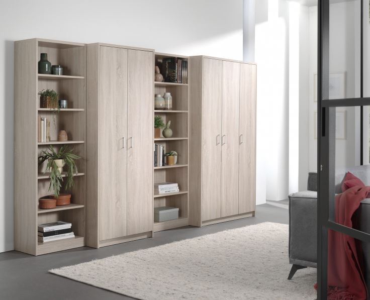 Meuble de Rangement « Spacio » 2 Portes et 5 Étagères Blanc/Sonoma/Chêne Gris
